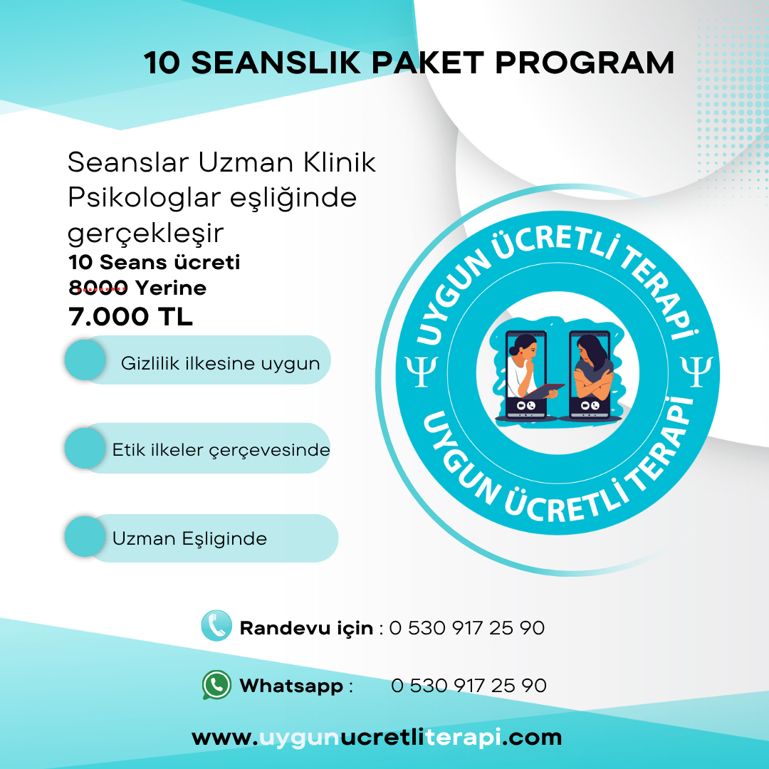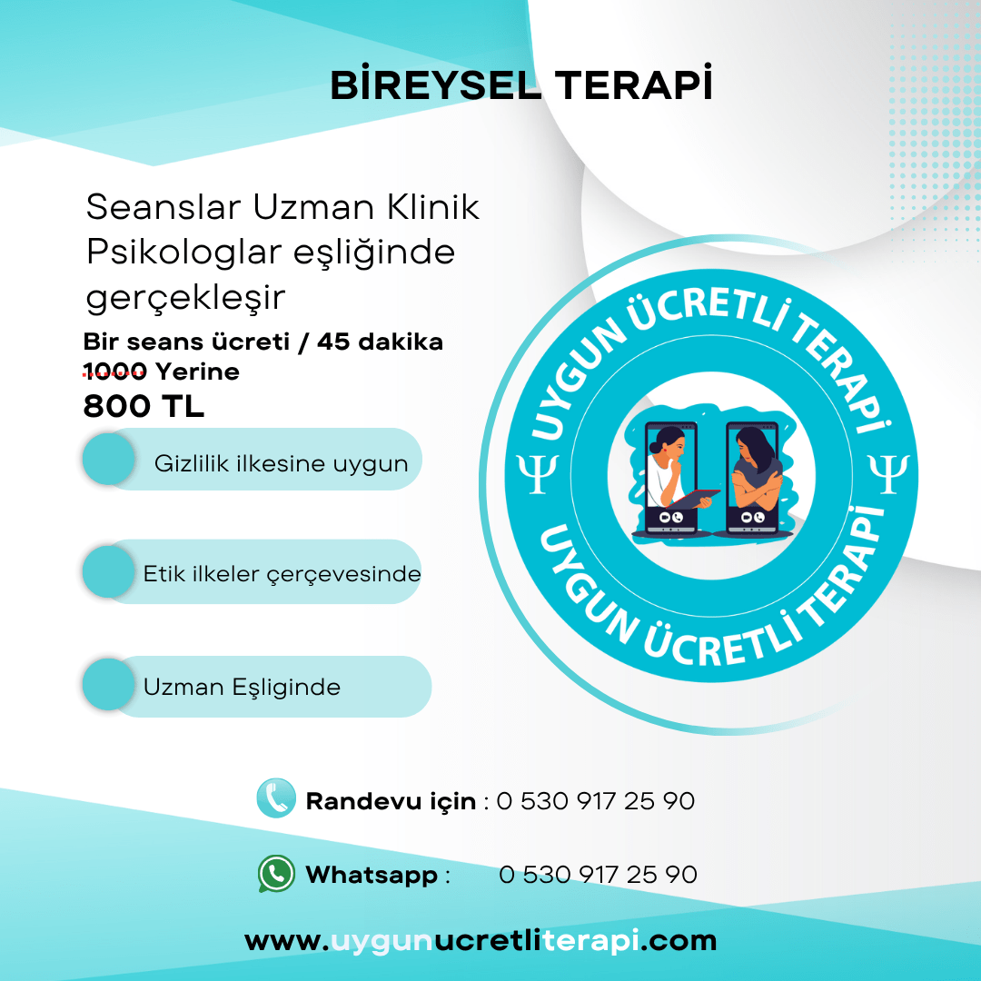 Psikolojik destek almayı düşünen pek çok kişi için psikolog fiyatları önemli bir belirleyici faktördür. Uygun Ücretli Terapi olarak, danışanlarımızın ruh sağlığı hizmetlerine erişimini kolaylaştırmak amacıyla ekonomik ve erişilebilir fiyat seçenekleri sunuyoruz.